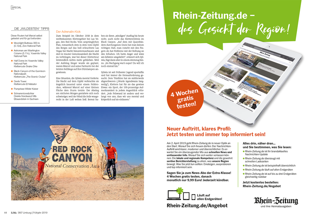 Im Jahr 2019 erschien ein mehrseitiger Beitrag zum Thema Klettern im "LiMa" Magazin Limburg, Protagonisten: Meine Partnerin Sylwia und ich im "Red Rock Canyon" bei Las Vegas. Bitte klicken, um die einzelnen Seiten zu vergrößern.