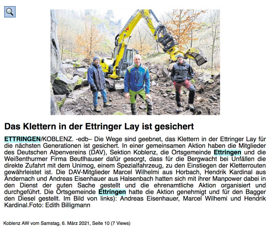 Was Klettern mit Baggern zu tun hat? Eine Menge! Gemeinsam mit 2 weiteren DAV-Mitgliedern habe ich im März 2020 dafür gesorgt, dass das Klettern in der Ettringer Ley gesichert ist. Der Zeitungs-Beitrag dazu:
